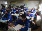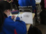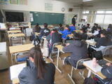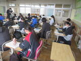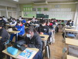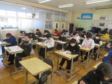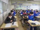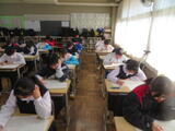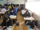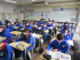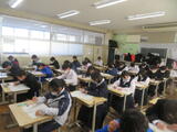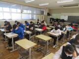 3組は国語。「いつものように新聞が届いた 今野俊宏」のところで、情報メディアを題材にした本文を読んで、自分の意見を考えていました。