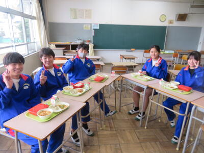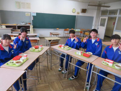 3年生と校長との会食32日目。将来の夢や北中での思い出などを聞かせてもらいました。また後輩へアドバイスとして、「1年生からちゃんと勉強しておいた方がいいと思います。今のうちに、友達とたくさん遊んで思い出をいっぱいつくってください。全部に全力を尽くしてほしいです。友達と仲良く生活する。いっぱい遊んで!! 」などがありました。ぜひ、参考にしてください。放送委員さんも、いつもごくろうさま。また、今日の給食のときに、JA佐野様からいただいた いちご が出ました。大変美味しくいただきました。ごちそうさまでした。JA佐野の皆様、ありがとうございました。