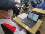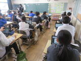 今日は3年生後半(4、5、6組)の授業を参観しました。4組は英語。タブレットで、デジタル教科書を使いリスニングを行っていました。