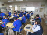 今日は1年生後半(3、4組)の授業を参観しました。3組は家庭科。被服室でざぶとん作りをしていました。