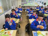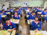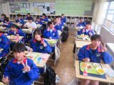 今日の給食風景は、3年6組。放送委員さん、ごくろうさま。