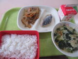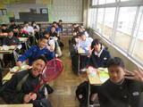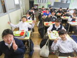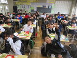 今日の給食風景は、1年3組。放送委員さん、ごくろうさま。