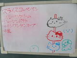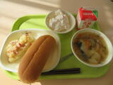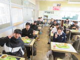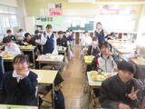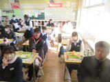 今日の給食風景は、3年1組。放送委員さん、ごくろうさま。