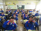 今日の給食風景は3年3組。放送委員さん、ごくろうさま。