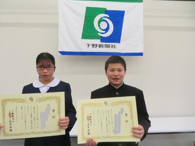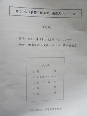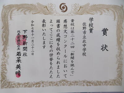 11月22日(土)、栃木県総合文化センターにおいて、第22回「新聞を読んで」感想文コンクールの表彰式が行われ、中学校1年生の部において、本校生2名が優良賞と入選に選ばれました。おめでとうございます。応募総数は982点。その中から35点が選ばれ、本日の表彰式となりました。また、県内の小学校、中学校、高等学校から6校が受賞する学校賞に、本校が選ばれました。ありがとうございました。新聞には、政治や経済、国際関係はもとより、スポーツや趣味に関することなど、さまざまな情報が盛りだくさんです。これからも、新聞に親しみ、世の中のことに関心をもちましょう。関係者の皆様、お世話になりました。保護者の皆様には、送迎などお世話になりました。