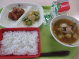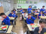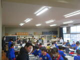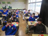 今日の給食風景は3年4組。放送委員さん、ごくろうさま。
