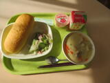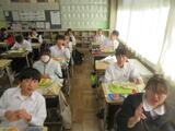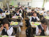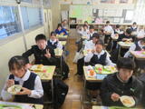 今日の給食風景は、2年1組。放送委員さん、ごくろうさま。
