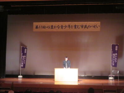 12月6日(土)、田沼中央公民館大ホールにおいて、「第11回 心豊かな青少年を育む市民のつどい」が開催されました。開会式の後、少年の主張発表があり、過日行われた「第48回栃木県少年の主張発表安足地区大会」で最優秀賞を受賞した本校3年生が、堂々と発表してくれました。学校帰りに、踏切の遮断機が故障した場面に遭遇し、友達と協力して交通誘導をした経験から、自ら判断して行動する大切さを発表してくれました。大変すばらしかったです。お疲れ様でした。保護者の方には、送迎などお世話になりました。また、大会関係者の皆様には、お世話になりました。