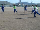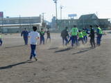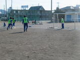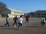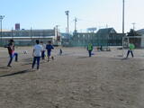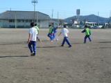 男子は校庭でサッカー。