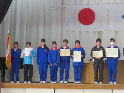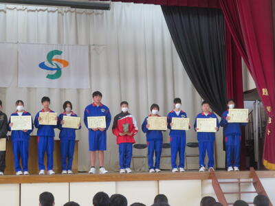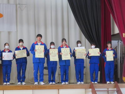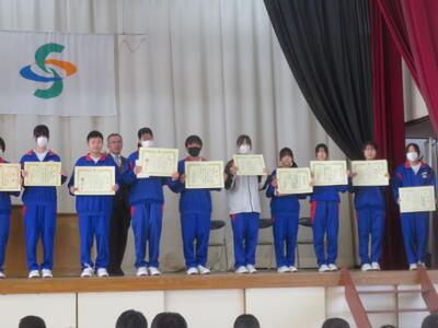 3時間目には、体育館で表彰がありました。県新人柔道大会、市学校芸術祭書写書道展、市中学校女子駅伝競走大会、市中学校駅伝競走大会、県学校音楽祭合奏の部・合唱の部、下野教育書道展、県中教研技術・家庭科部会生徒作品展、食育推進絵画・ポスターコンクール、よい歯のコンクール ポスター・標語・よい歯の優良学校、税についての作文、市サッカー交流大会、小さな親切作文コンクール、新聞を読んで感想文コンクール、学校芸術祭佐野市小・中学校児童生徒造形展、県中学校作曲コンクール、中村儀一杯バレーボール大会 県柔道ルーキーズ大会 及び 市秋季ソフトテニス大会 の賞状伝達を行いました。受賞した皆さん、おめでとうございます。