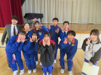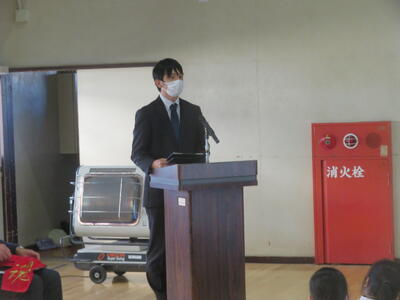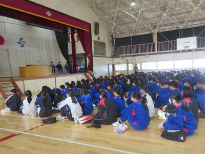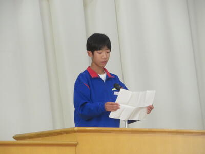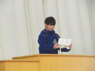 次に生徒の集いがありました。各学年の代表生徒による、今年の振り返りと新年の抱負の発表がありました。皆、学習や部活、行事や生活などをしっかり振り返り、新年はこうしたいという内容で、大変参考になる発表でした。グッジョブ。