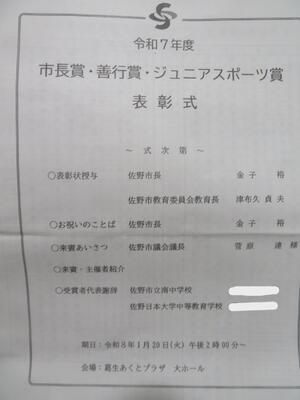 午後には、葛生あくとプラザ大ホールにおいて、市長賞・善行賞とジュニアスポーツ賞の表彰式が行われ、本校3年生が参加しました。受賞おめでとうございます。関係者の皆様には、大変お世話になりました。また、保護者の皆様には、送迎などお世話になりました。