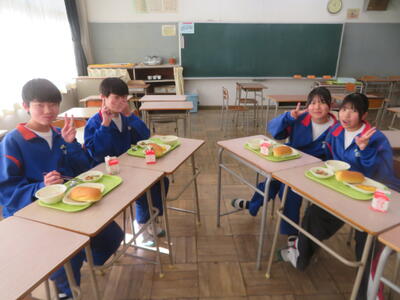 3年生と校長との会食28日目。将来の夢や北中での思い出などを聞かせてもらいました。また後輩へアドバイスとして、「いい成績をとろう。今のうちに勉強をたくさんしておいた方がいい。勉強と遊ぶときのメリハリをつける。定期テストの解き直しをする。ほんとにぜったい勉強早くからしたほうがいい!!」などがありました。ぜひ、参考にしてください。放送委員さんも、いつもごくろうさま。また学校栄養士の先生の食に関する放送がありました。節分や立春に関わる食の話で、豆まきの大豆について、記憶を助ける「レシチン」や「イソフラボン」などが多く含まれているという解説がありました。大豆は体に、とてもダイズです。