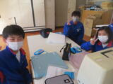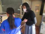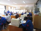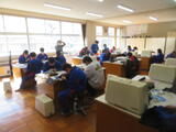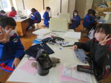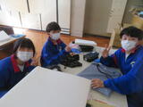 今日は1年生後半(3、4組)の授業を参観しました。3組は家庭科。被服室でざぶとん作りをしていました。
