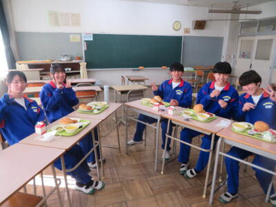 3年生と校長との会食32日目。将来の夢や北中での思い出などを聞かせてもらいました。また後輩へアドバイスとして、「1年生からちゃんと勉強しておいた方がいいと思います。今のうちに、友達とたくさん遊んで思い出をいっぱいつくってください。全部に全力を尽くしてほしいです。友達と仲良く生活する。いっぱい遊んで!! 」などがありました。ぜひ、参考にしてください。放送委員さんも、いつもごくろうさま。また、今日の給食のときに、JA佐野様からいただいた いちご が出ました。大変美味しくいただきました。ごちそうさまでした。JA佐野の皆様、ありがとうございました。