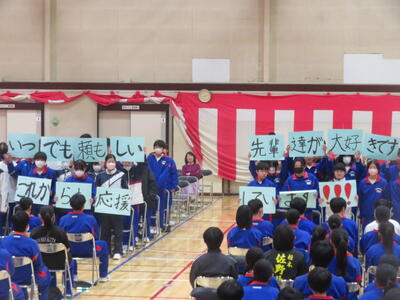 午後には、3年生を送る会が行われました。生徒会の皆さんが趣向の凝らしたクイズなどを準備してくれたので、大変盛り上がりました。皆さん、お疲れ様でした。グッジョブ。