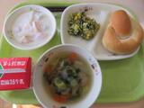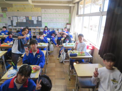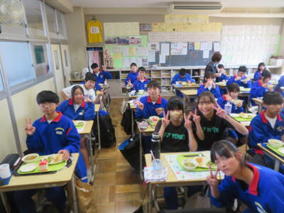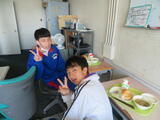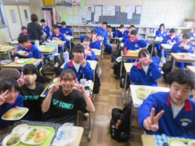今日の給食風景は、2年3組。放送委員さんも、いつもごくろうさま。