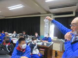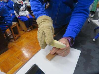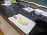 校舎を回っていると、理科室では液体窒素を使った実験が行われていました。バナナで釘を打つことができました。すごっ!
