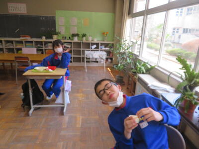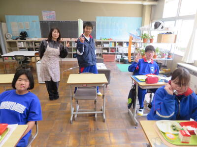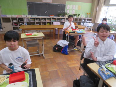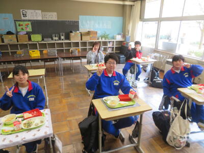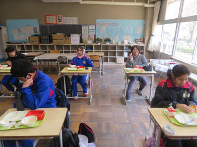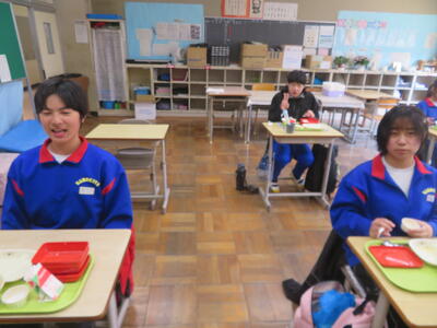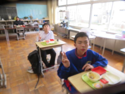 今日の給食風景は、みかも学級。放送委員さん、ごくろうさま。