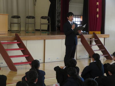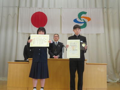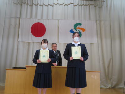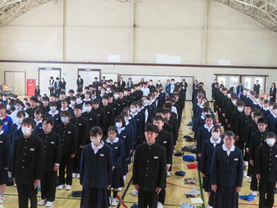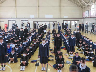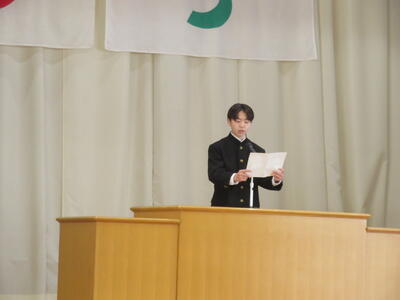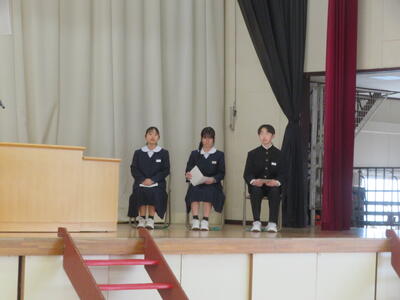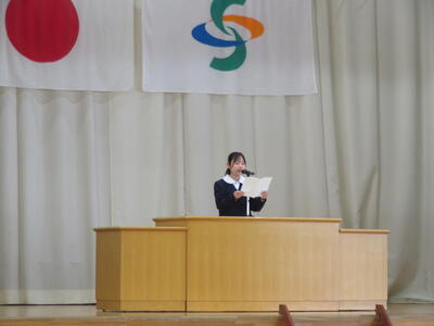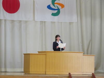 続いて、代表生徒による「今年度の振り返りと来年度の抱負」の発表がありました。いずれも、学習や生活、部活動のことなどを振り返り、仲間の大切さ、あきらめないで挑戦する大切さ、小さな親切があふれていたことなどの今年度のよさと、来年度に向けた学校生活の向上を目指したすばらしい発表をしてくれました。