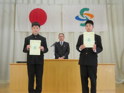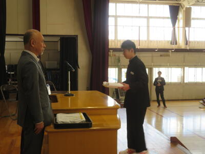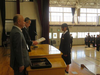 次に、令和7年度修了式があり、各学年代表の生徒に修了証が手渡されました。