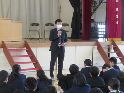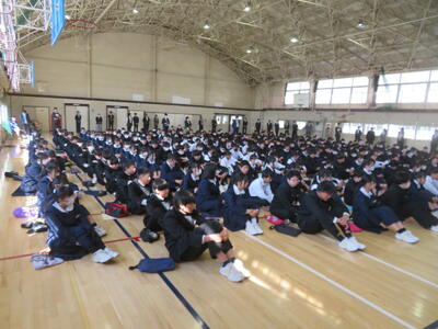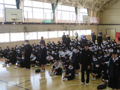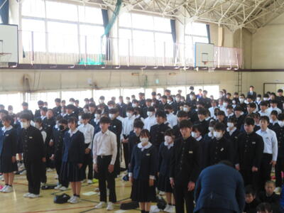 その後、春休みの過ごし方について、生徒指導担当からは、①SNSを正しく使う ②公共の場での言動に注意する ③お泊まり禁止 ④こまったら相談する の4点について話がありました。
